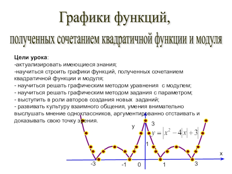 -научиться строить графики функций, полученных сочетанием квадратичной функции и модуля;