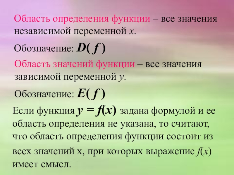 Если функция у = f(х) задана формулой и ее область определения не указана, то считают, что область определения функции состоит из всех значений х, при которых выражение f(х) имеет смысл.