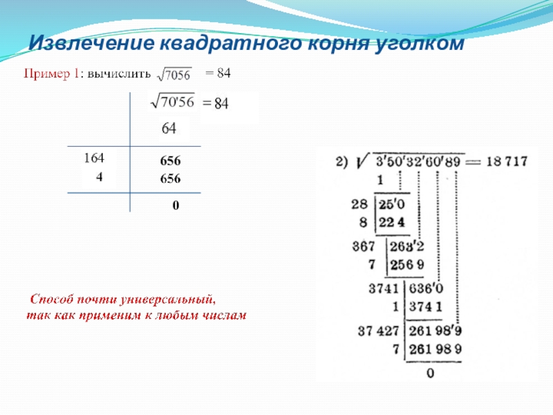 Слайд 14Извлечение квадратного корня уголком