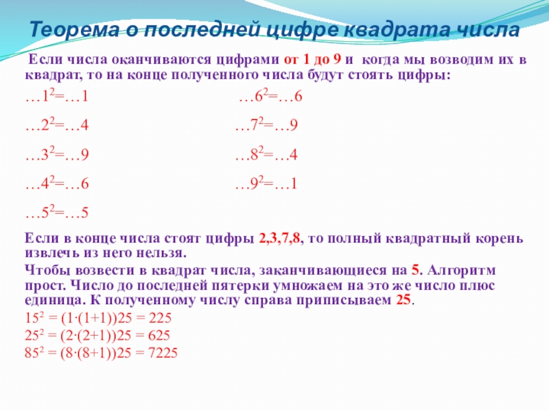 Слайд 6Теорема о последней цифре квадрата числа