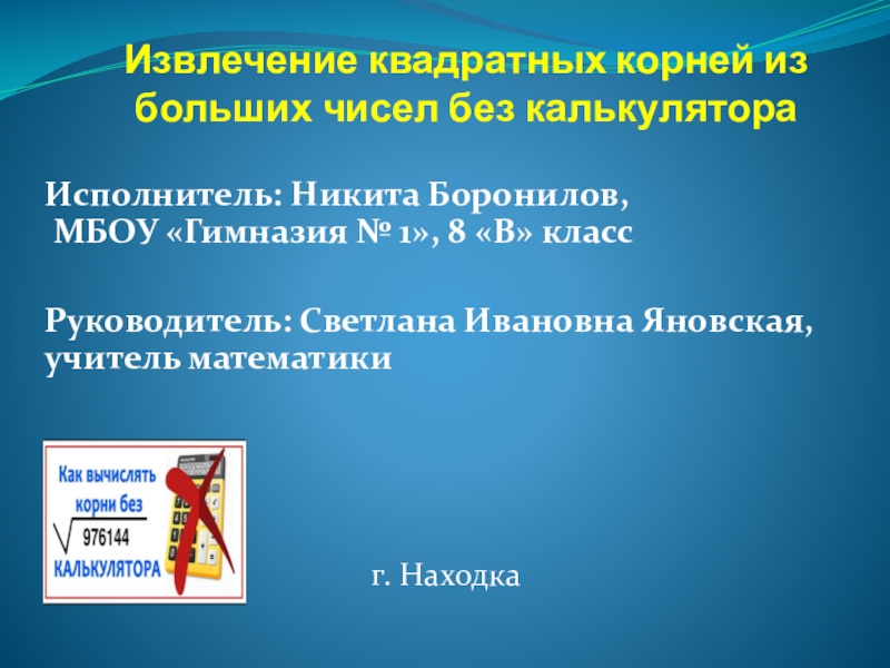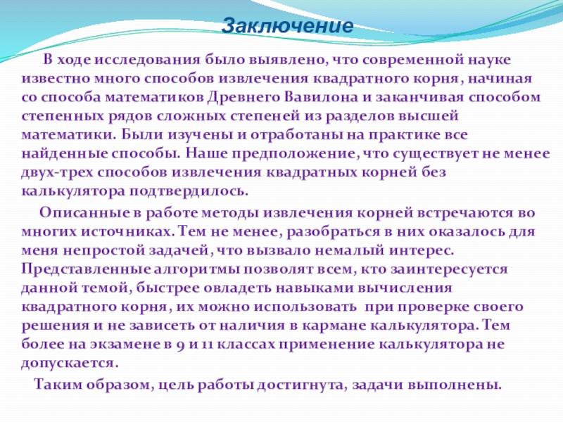 Описанные в работе методы извлечения корней встречаются во многих источниках. Тем не менее, разобраться в них оказалось для меня непростой задачей, что вызвало немалый интерес. Представленные алгоритмы позволят всем, кто заинтересуется данной темой, быстрее овладеть навыками вычисления квадратного корня, их можно использовать при проверке своего решения и не зависеть от наличия в кармане калькулятора. Тем более на экзамене в 9 и 11 классах применение калькулятора не допускается.