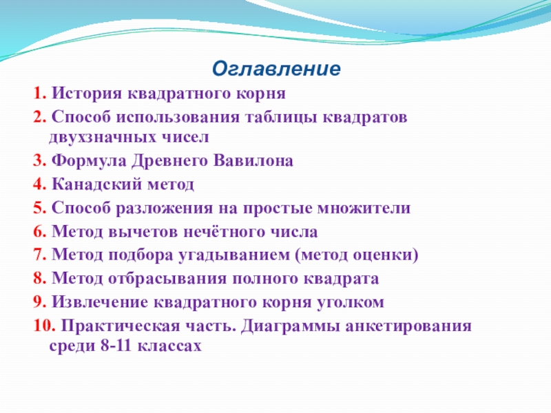 известно много способов извлечения квадратного корня, начиная со способа математиков Древнего Вавилона и заканчивая способом степенных рядов сложных степеней из разделов высшей математики. Были изучены и отработаны на практике все найденные способы. Наше предположение, что существует не менее двух-трех способов извлечения квадратных корней без калькулятора подтвердилось.