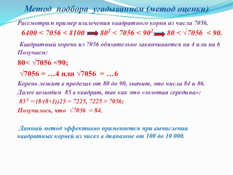 Данный метод эффективно применяется при вычислении квадратных корней из чисел в диапазоне от 100 до 10 000.