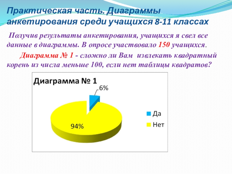 Слайд 15Практическая часть. Диаграммы анкетирования среди учащихся 8-11 классах