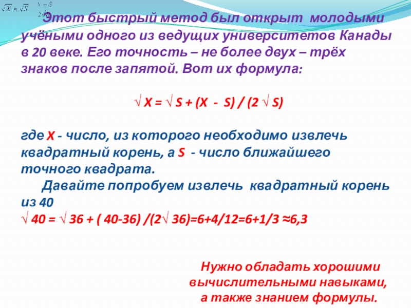 Этот быстрый метод был открыт молодыми учёными одного из ведущих университетов Канады в 20 веке. Его точность – не более двух – трёх знаков после запятой. Вот их формула: