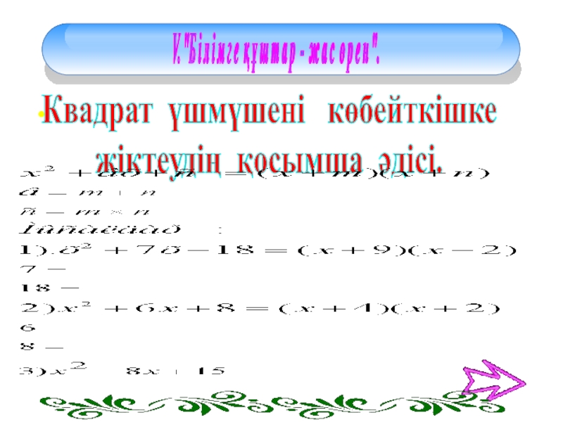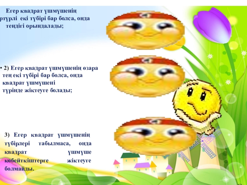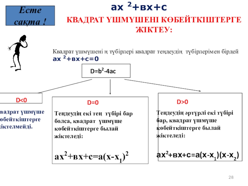 3) Егер квадрат үшмүшенің түбірлері табылмаса, онда квадрат үшмүше көбейткіштерге жіктеуге болмайды.
