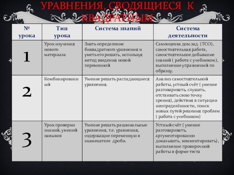 -формирование умений решать уравнения, сводящиеся к квадратным;