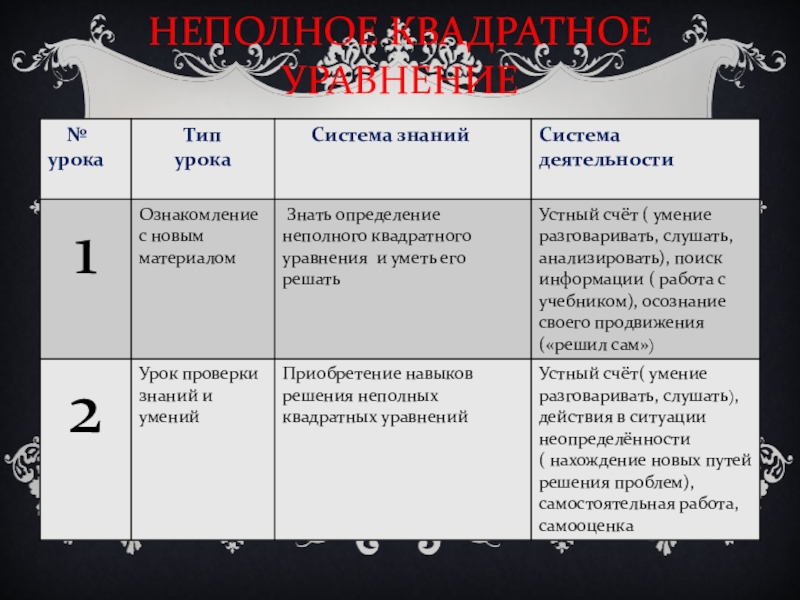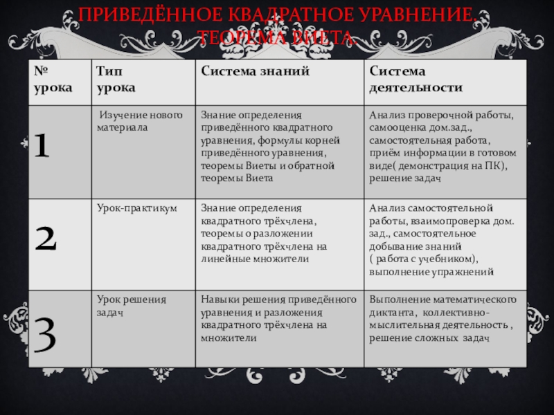 -формирование представлений о полном, приведённом, неполном квадратном уравнении, о дискриминанте, о