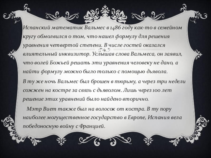 обмолвился о том, что нашел формулу для решения уравнения четвертой степени. В числе гостей оказался влиятельный инквизитор. Услышав слова Вальмеса, он заявил, что волей Божьей решать эти уравнения человеку не дано, а найти формулу можно было только с помощью дьявола.