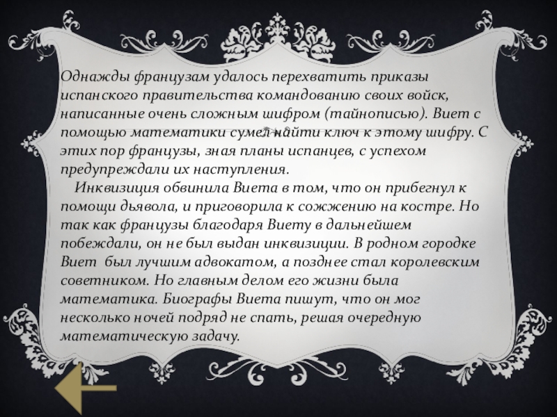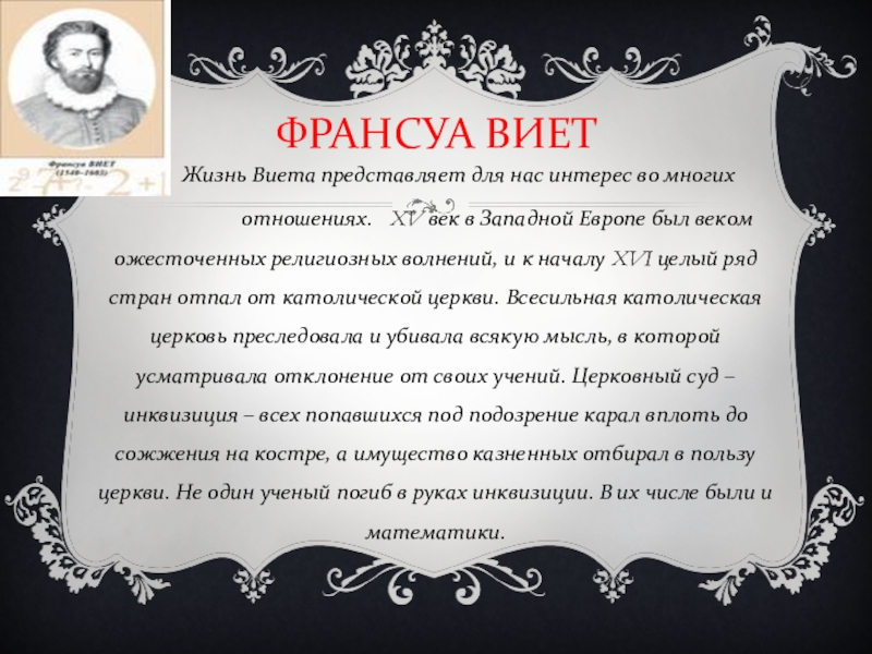 Инквизиция обвинила Виета в том, что он прибегнул к помощи дьявола, и приговорила к сожжению на костре. Но так как французы благодаря Виету в дальнейшем побеждали, он не был выдан инквизиции. В родном городке Виет был лучшим адвокатом, а позднее стал королевским советником. Но главным делом его жизни была математика. Биографы Виета пишут, что он мог несколько ночей подряд не спать, решая очередную математическую задачу.