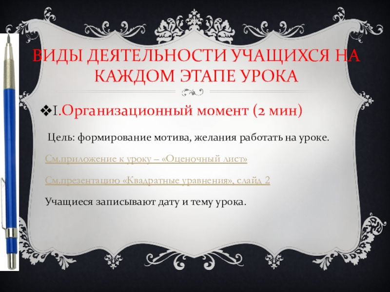 Слайд 25ВИДЫ ДЕЯТЕЛЬНОСТИ УЧАЩИХСЯ НА КАЖДОМ ЭТАПЕ УРОКА