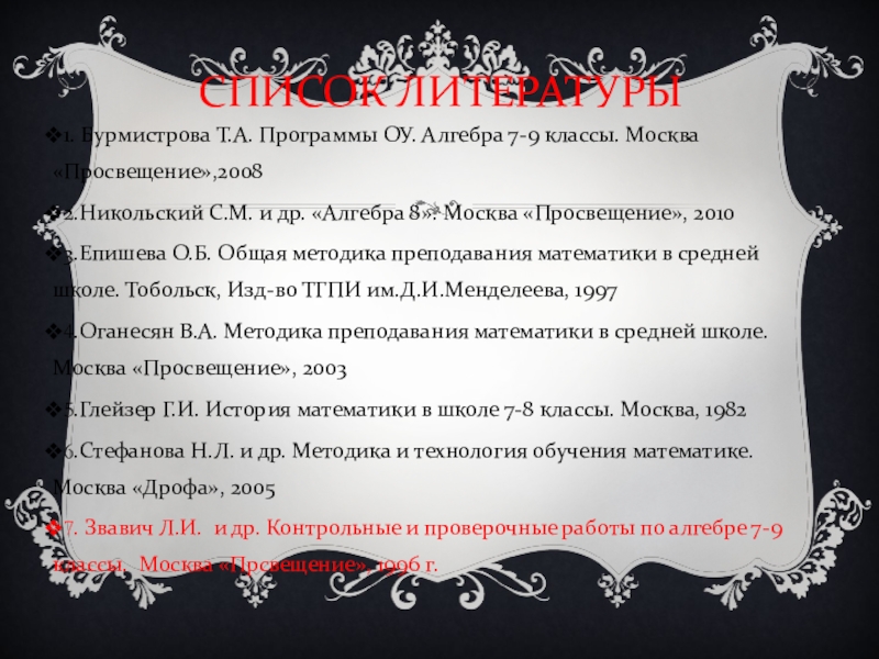 1. Бурмистрова Т.А. Программы ОУ. Алгебра 7-9 классы. Москва «Просвещение»,2008