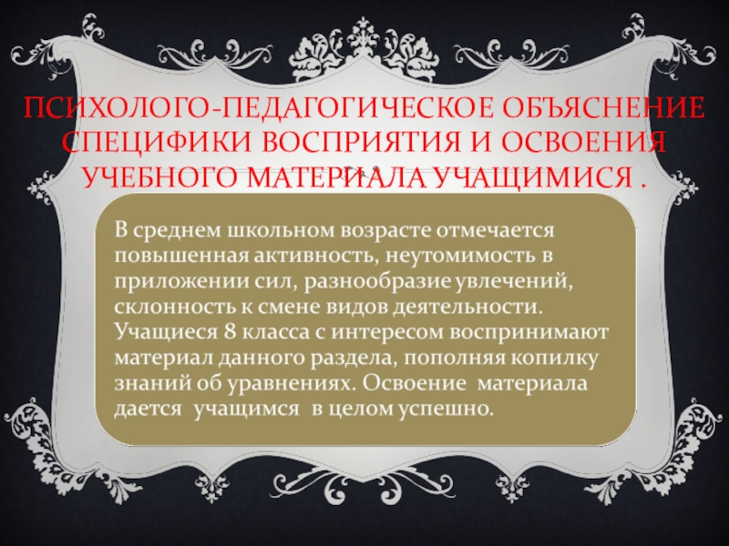 Слайд 8ПСИХОЛОГО-ПЕДАГОГИЧЕСКОЕ ОБЪЯСНЕНИЕ СПЕЦИФИКИ ВОСПРИЯТИЯ И ОСВОЕНИЯ УЧЕБНОГО МАТЕРИАЛА УЧАЩИМИСЯ .