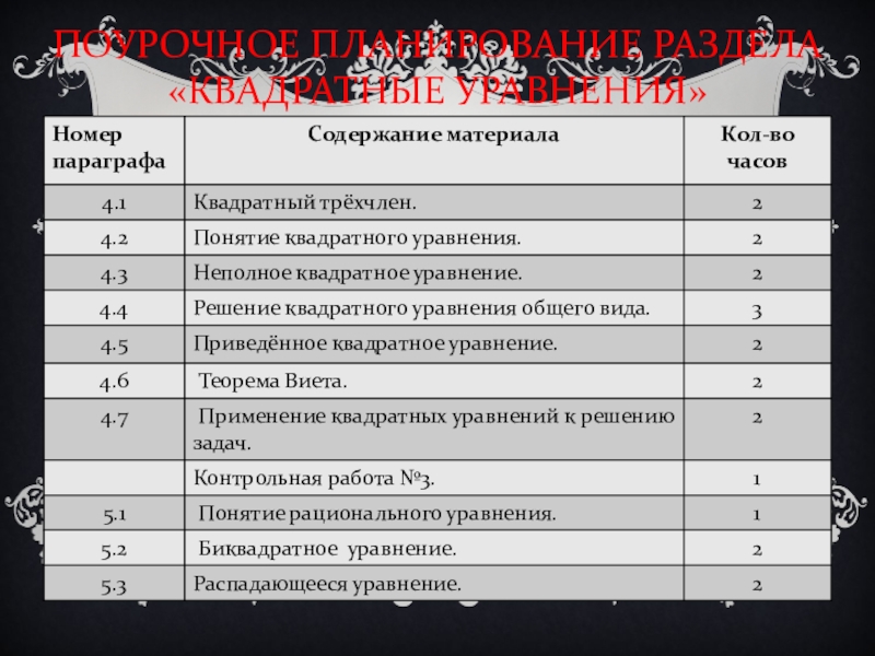 Слайд 19ПОУРОЧНОЕ ПЛАНИРОВАНИЕ РАЗДЕЛА «КВАДРАТНЫЕ УРАВНЕНИЯ»