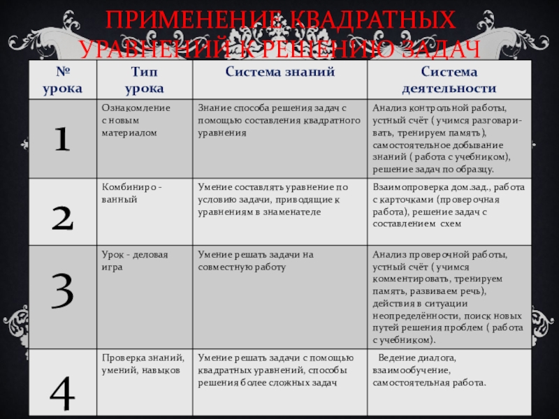 -формирование устойчивых навыков в решении задач с помощью квадратных уравнений.