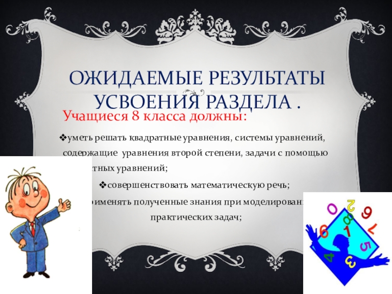 - Овладение умением разложения квадратного трёхчлена на множители, решения квадратного уравнения по соответствующим формулам;