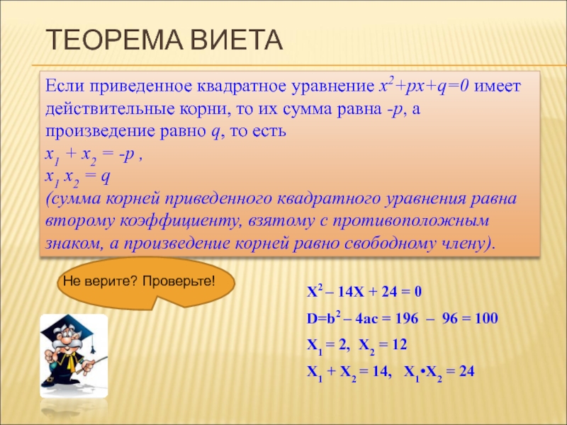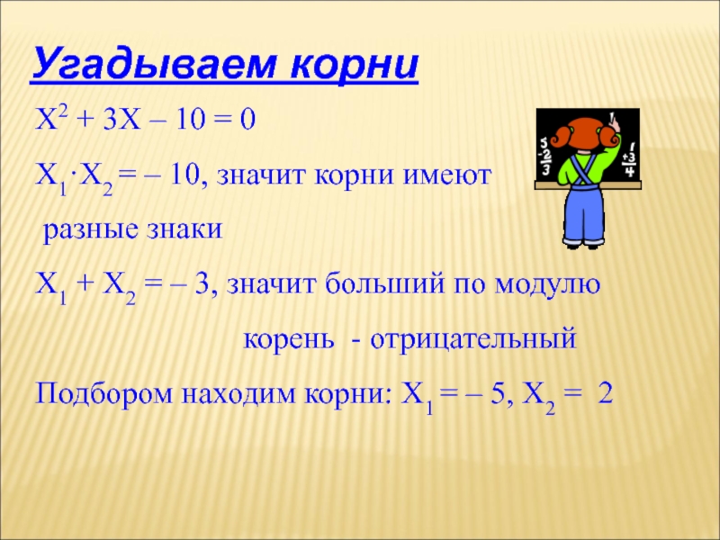 Рассмотрим примеры решения полных квадратных уравнений, т. е. таких уравнений, у которых все три коэффициента отличны от нуля. Начнём с уравнений, в которых первый коэффициент равен 1. Такие уравнения называют приведенными квадратными уравнениями.