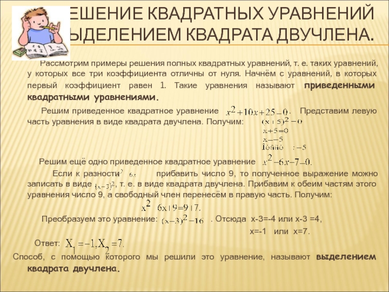 Способ, с помощью которого мы решили это уравнение, называют выделением квадрата двучлена.