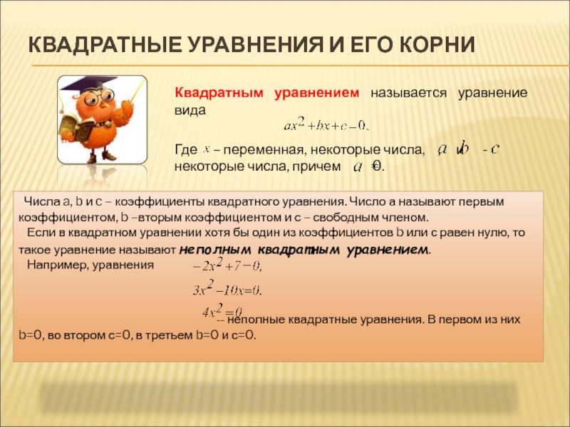Числа a, b и c – коэффициенты квадратного уравнения. Число а называют первым коэффициентом, b –вторым коэффициентом и с – свободным членом.
