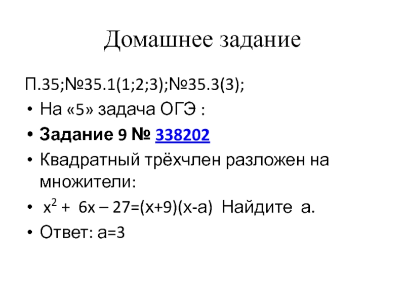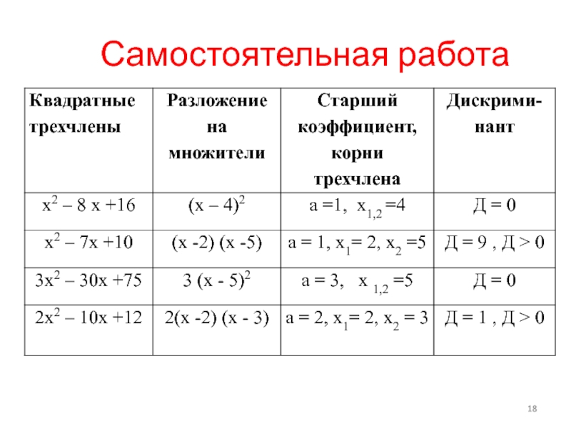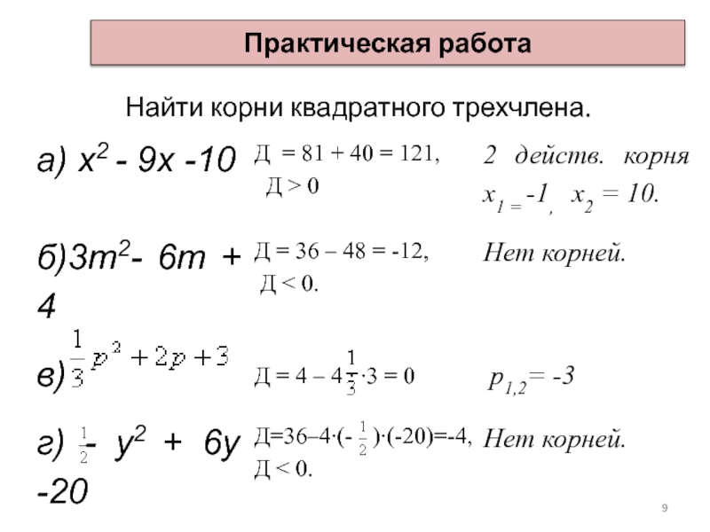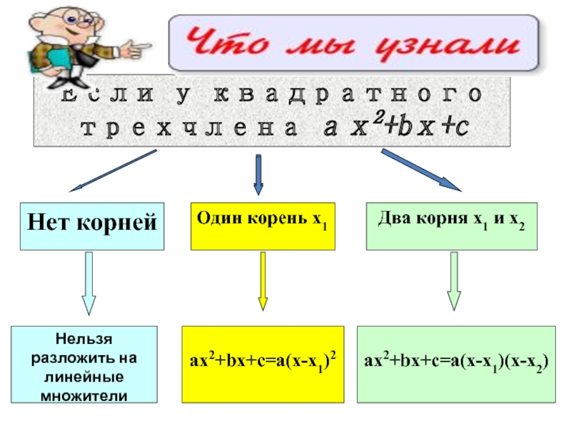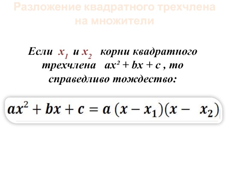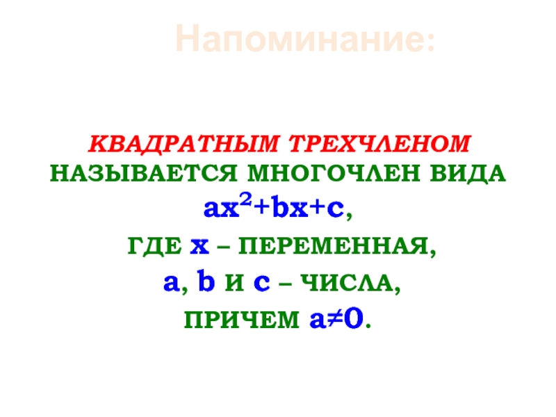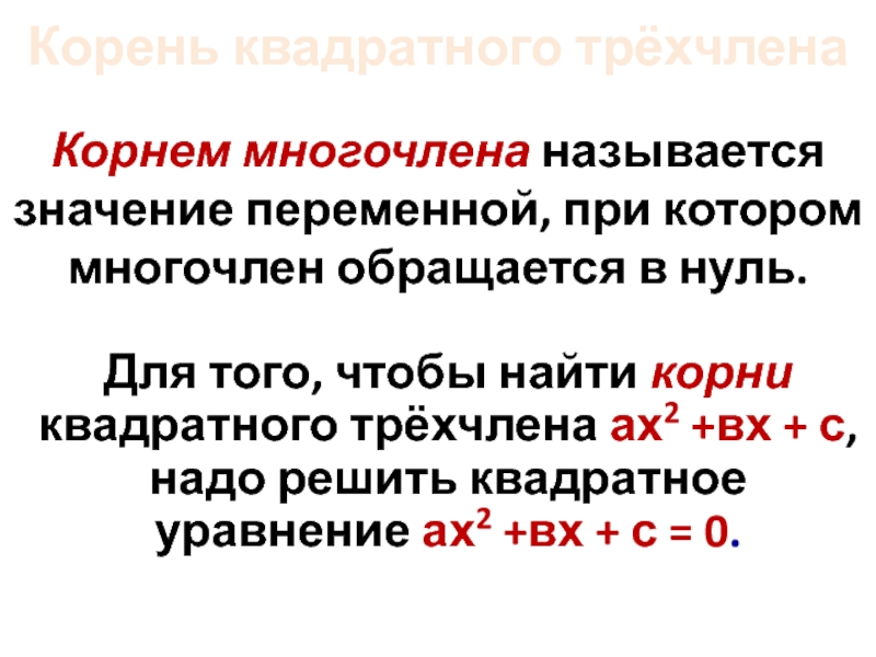Для того, чтобы найти корни квадратного трёхчлена ах2 +вх + с, надо решить квадратное уравнение ах2 +вх + с = 0.