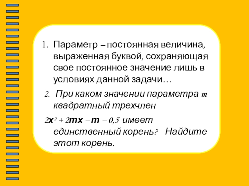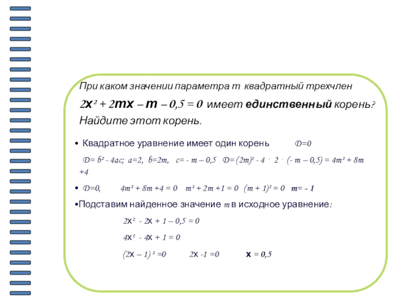 D= b² - 4ac; a=2, b=2m, c= - m – 0,5 D= (2m)² - 4 ⋅ 2 ⋅ (- m – 0,5) = 4m² + 8m +4