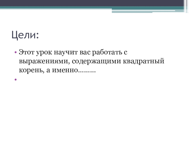 Цели:Этот урок научит вас работать с выражениями, содержащими квадратный корень, а именно………