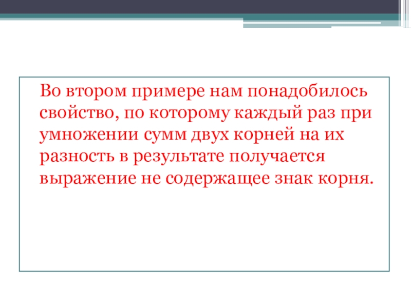 Во втором примере нам понадобилось свойство, по которому каждый раз при умножении сумм двух корней