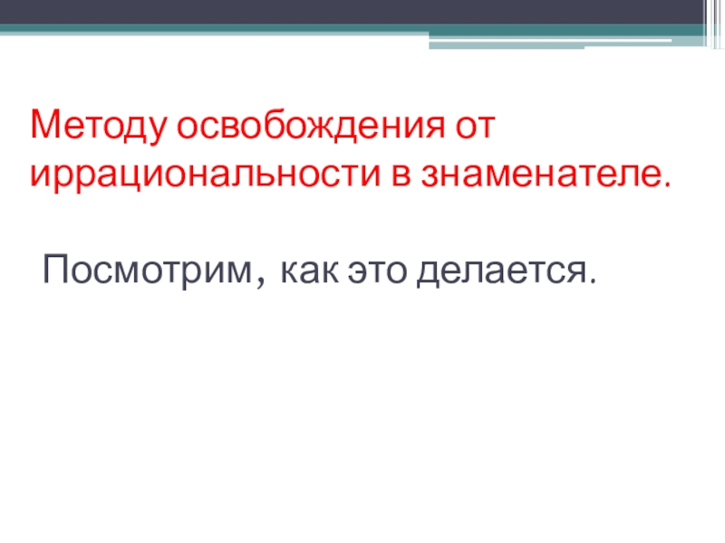 Слайд 3Методу освобождения от иррациональности в знаменателе.  Посмотрим, как это делается.
