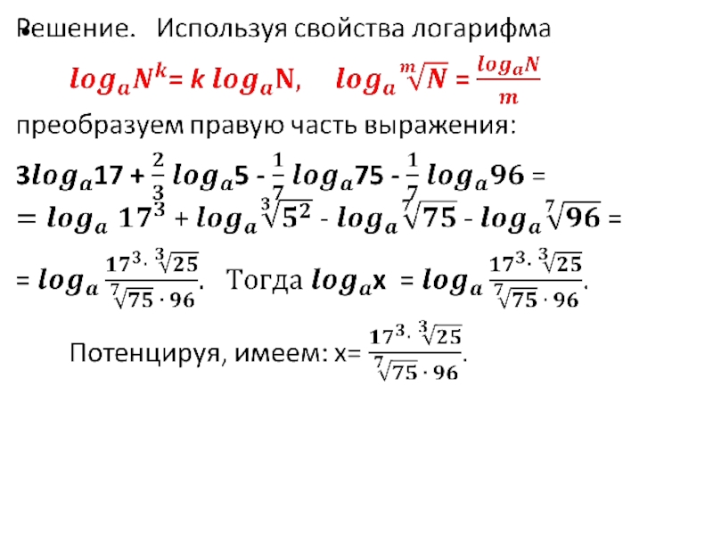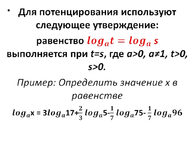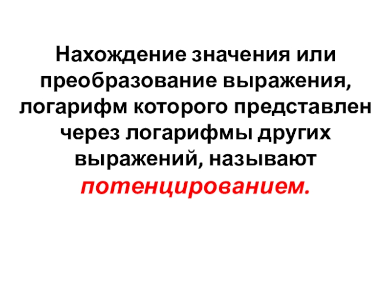 Нахождение значения или преобразование выражения, логарифм которого представлен через логарифмы других выражений, называют потенцированием.