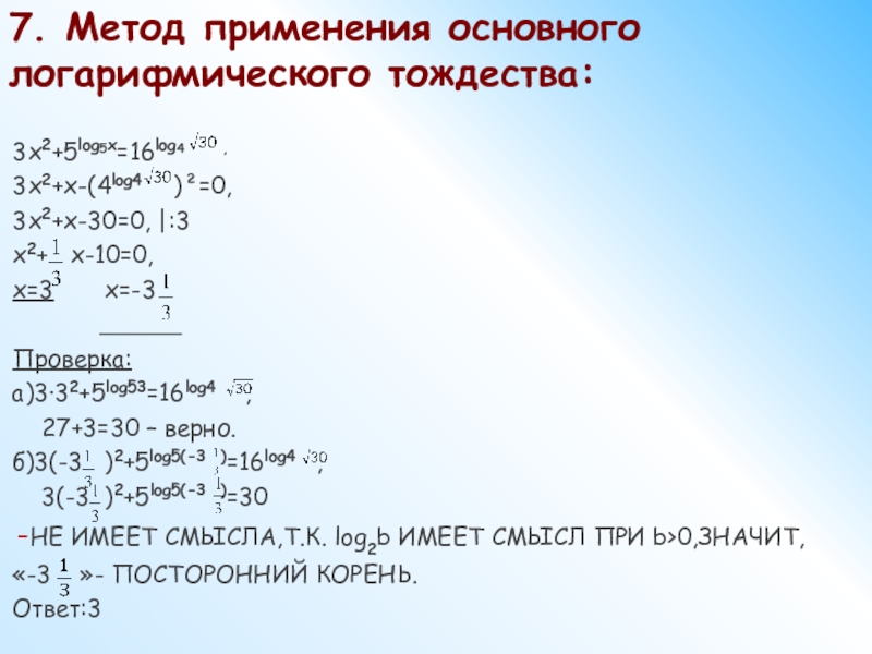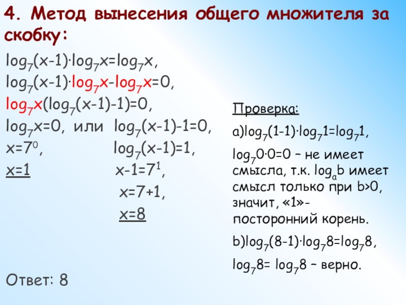 log70·0=0 – не имеет смысла, т.к. logab имеет смысл только при b>0,значит, «1»- посторонний корень.
