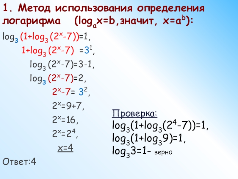 1. Метод использования определения логарифма (logax=b,значит, x=ab):