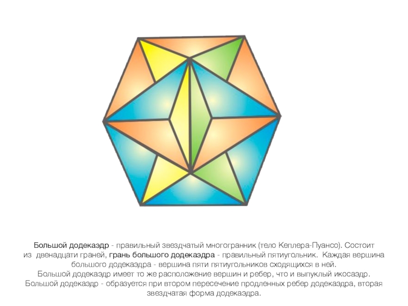 Слайд 23Большой додекаэдр - правильный звездчатый многогранник (тело Кеплера-Пуансо). Состоит из двенадцати граней, грань большого додекаэдра - правильный