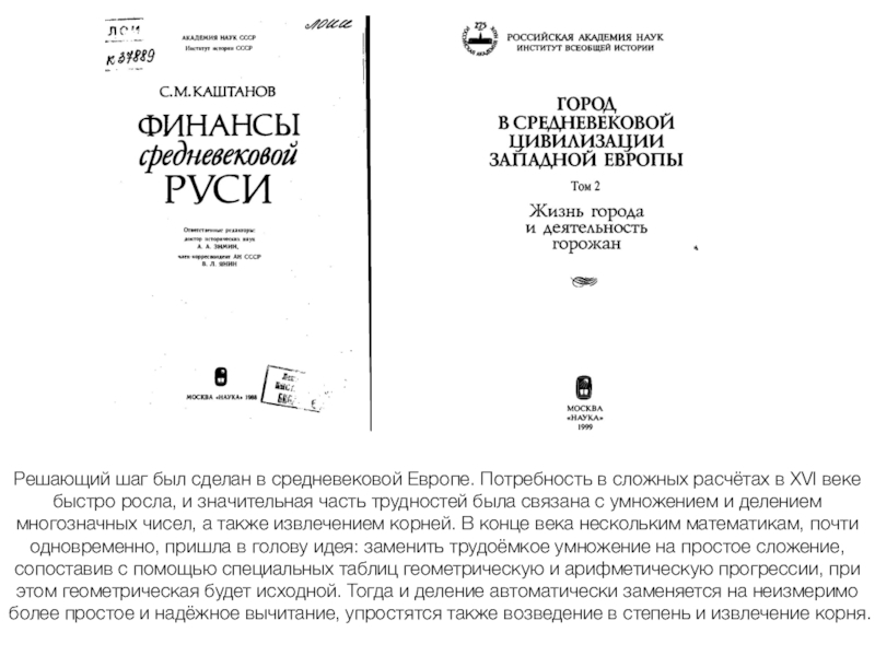 в XVI веке быстро росла, и значительная часть трудностей была связана с умножением и делением многозначных чисел, а также извлечением корней. В конце века нескольким математикам, почти одновременно, пришла в голову идея: заменить трудоёмкое умножение на простое сложение, сопоставив с помощью специальных таблиц геометрическую и арифметическую прогрессии, при этом геометрическая будет исходной. Тогда и деление автоматически заменяется на неизмеримо более простое и надёжное вычитание, упростятся также возведение в степень и извлечение корня.