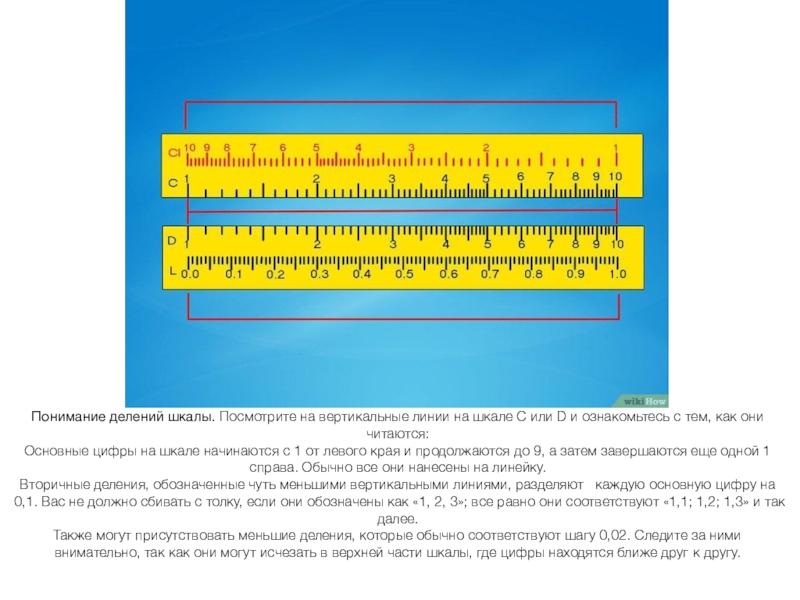 Слайд 14Понимание делений шкалы. Посмотрите на вертикальные линии на шкале C или D