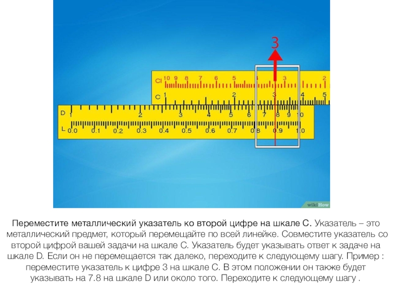 это металлический предмет, который перемещайте по всей линейке. Совместите указатель со второй цифрой вашей задачи на шкале C. Указатель будет указывать ответ к задаче на шкале D. Если он не перемещается так далеко, переходите к следующему шагу. Пример : переместите указатель к цифре 3 на шкале C. В этом положении он также будет указывать на 7.8 на шкале D или около того. Переходите к следующему шагу .