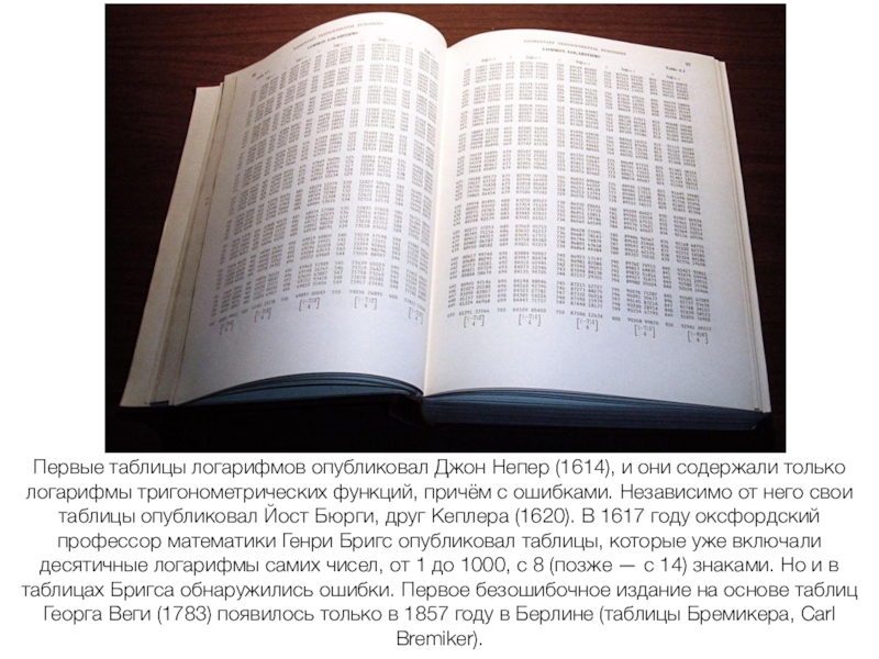 логарифмы тригонометрических функций, причём с ошибками. Независимо от него свои таблицы опубликовал Йост Бюрги, друг Кеплера (1620). В 1617 году оксфордский профессор математики Генри Бригс опубликовал таблицы, которые уже включали десятичные логарифмы самих чисел, от 1 до 1000, с 8 (позже — с 14) знаками. Но и в таблицах Бригса обнаружились ошибки. Первое безошибочное издание на основе таблиц Георга Веги (1783) появилось только в 1857 году в Берлине (таблицы Бремикера, Carl Bremiker).