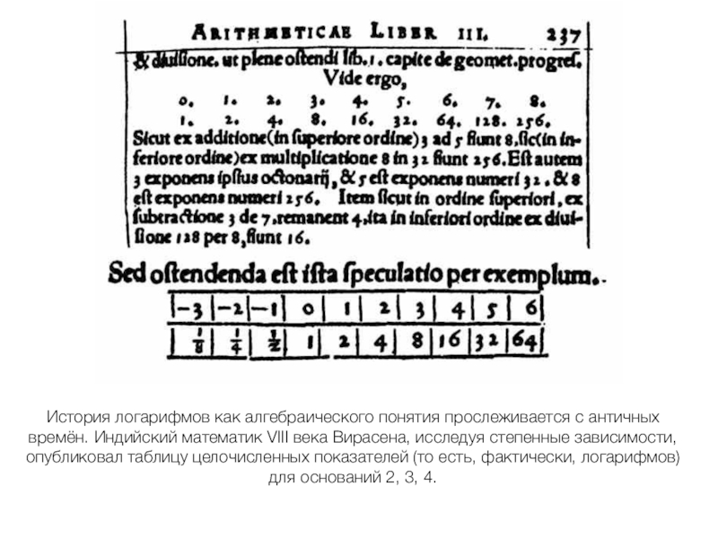 Слайд 2История логарифмов как алгебраического понятия прослеживается с античных времён. Индийский математик