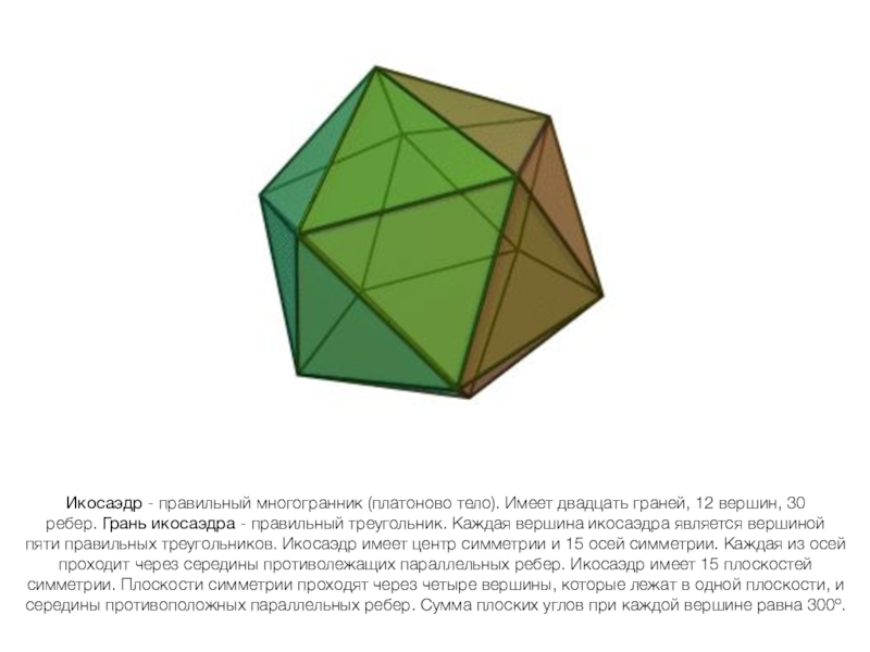 Слайд 21Икосаэдр - правильный многогранник (платоново тело). Имеет двадцать граней, 12 вершин, 30 ребер. Грань икосаэдра - правильный