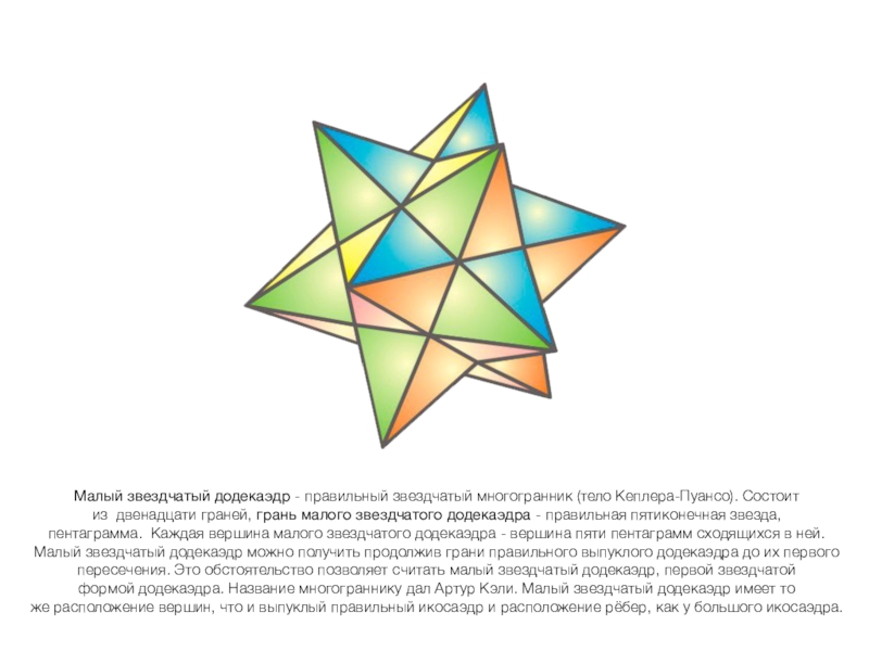 Слайд 24Малый звездчатый додекаэдр - правильный звездчатый многогранник (тело Кеплера-Пуансо). Состоит из двенадцати граней, грань малого звездчатого