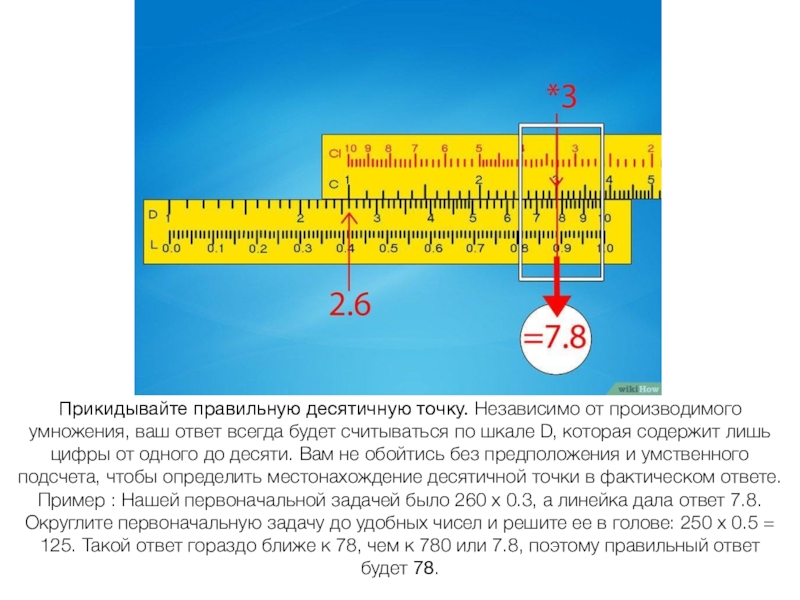 считываться по шкале D, которая содержит лишь цифры от одного до десяти. Вам не обойтись без предположения и умственного подсчета, чтобы определить местонахождение десятичной точки в фактическом ответе. Пример : Нашей первоначальной задачей было 260 x 0.3, а линейка дала ответ 7.8. Округлите первоначальную задачу до удобных чисел и решите ее в голове: 250 x 0.5 = 125. Такой ответ гораздо ближе к 78, чем к 780 или 7.8, поэтому правильный ответ будет 78.