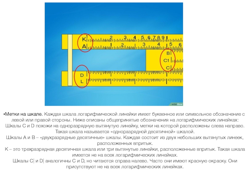 Слайд 13Метки на шкале. Каждая шкала логарифмической линейки имеет буквенное или символьное обозначение