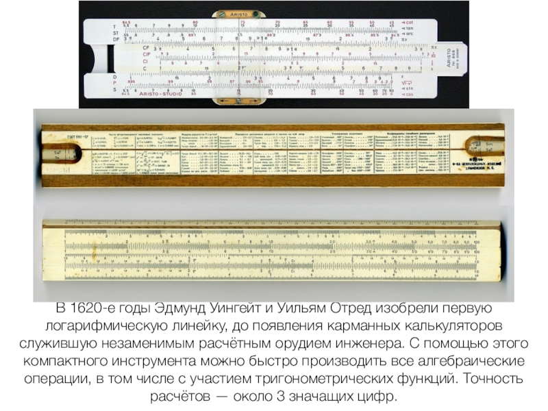Слайд 7В 1620-е годы Эдмунд Уингейт и Уильям Отред изобрели первую логарифмическую