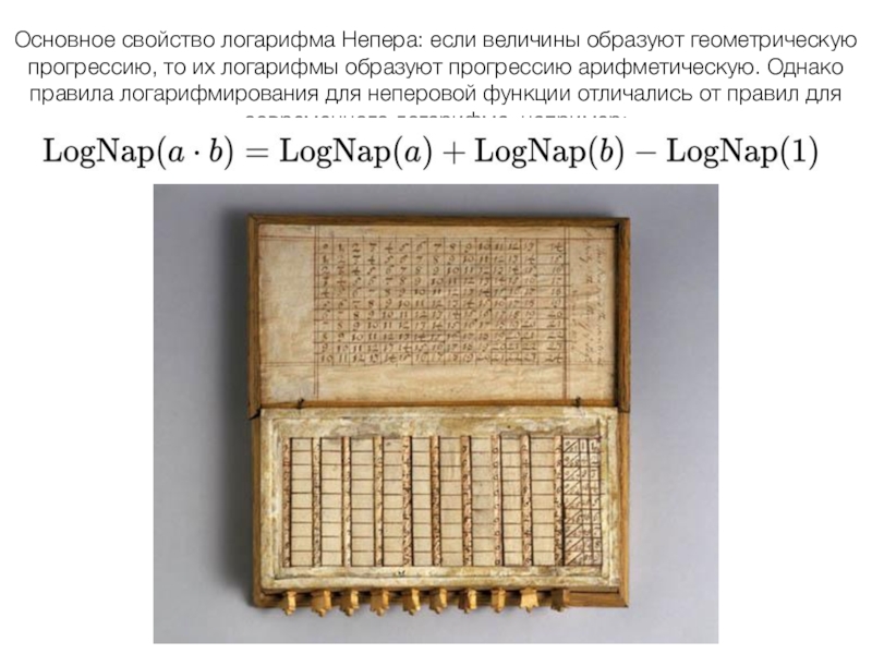 логарифмы образуют прогрессию арифметическую. Однако правила логарифмирования для неперовой функции отличались от правил для современного логарифма, например: