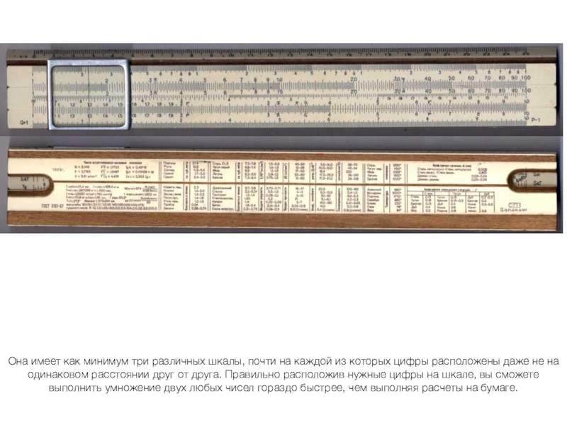 которых цифры расположены даже не на одинаковом расстоянии друг от друга. Правильно расположив нужные цифры на шкале, вы сможете выполнить умножение двух любых чисел гораздо быстрее, чем выполняя расчеты на бумаге.