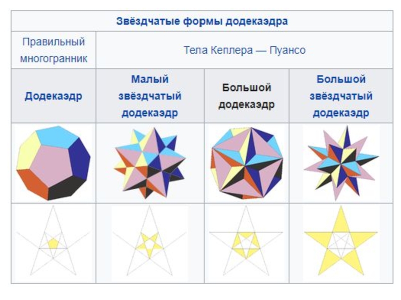 додекаэдра - правильная пятиконечная звезда, пентаграмма. Каждая вершина малого звездчатого додекаэдра - вершина пяти пентаграмм сходящихся в ней.