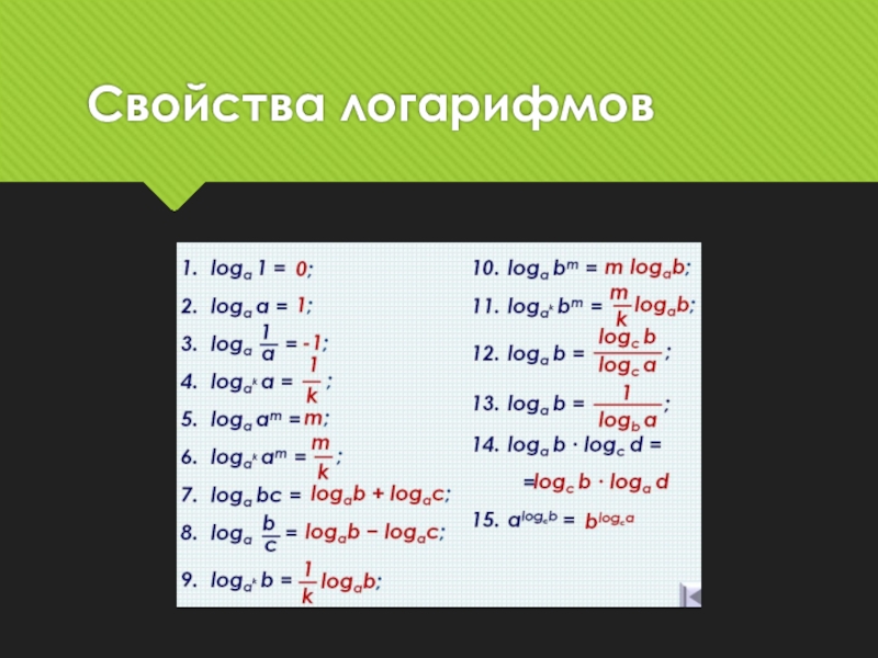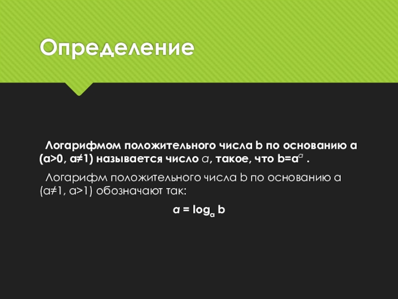 Определение Логарифмом положительного числа b по основанию a (a>0, a≠1) называется число α, такое, что b=aa . Логарифм положительного числа b по основанию a (a≠1, a>1) обозначают так:a = loga b