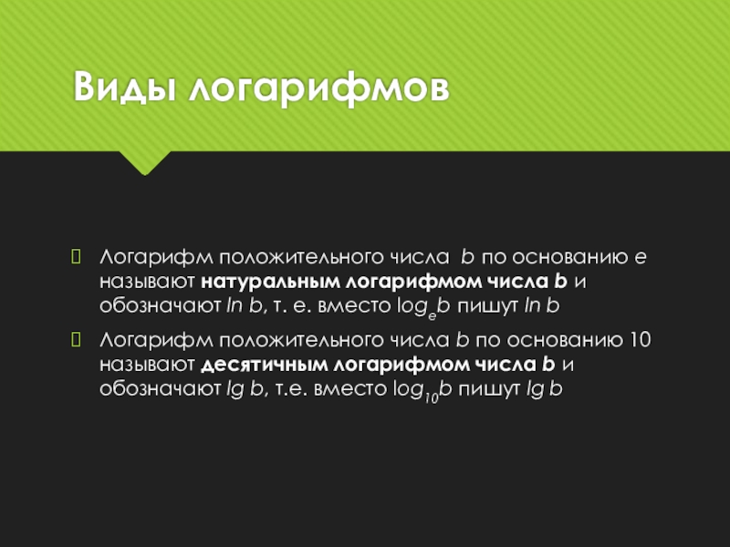 Виды логарифмовЛогарифм положительного числа b по основанию e называют натуральным логарифмом числа b и обозначают ln b,