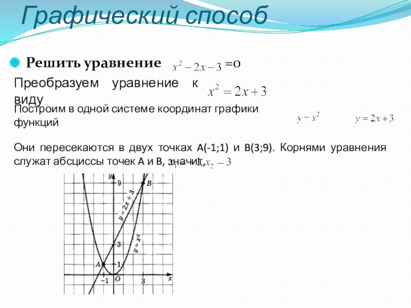Они пересекаются в двух точках A(-1;1) и B(3;9). Корнями уравнения служат абсциссы точек A и B, значит,