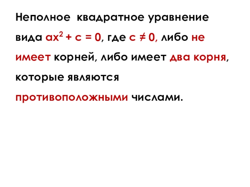 Слайд 20Неполное квадратное уравнение вида ax2 + с = 0, где с
