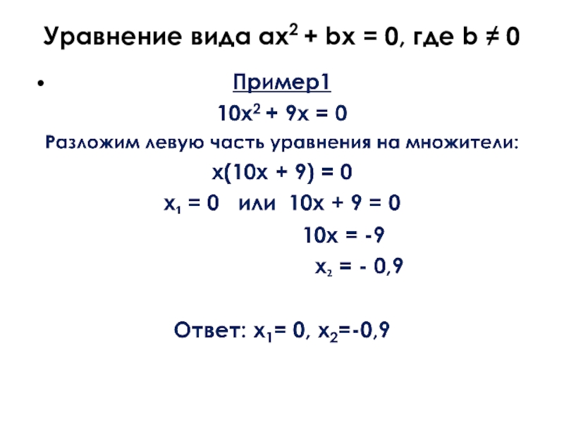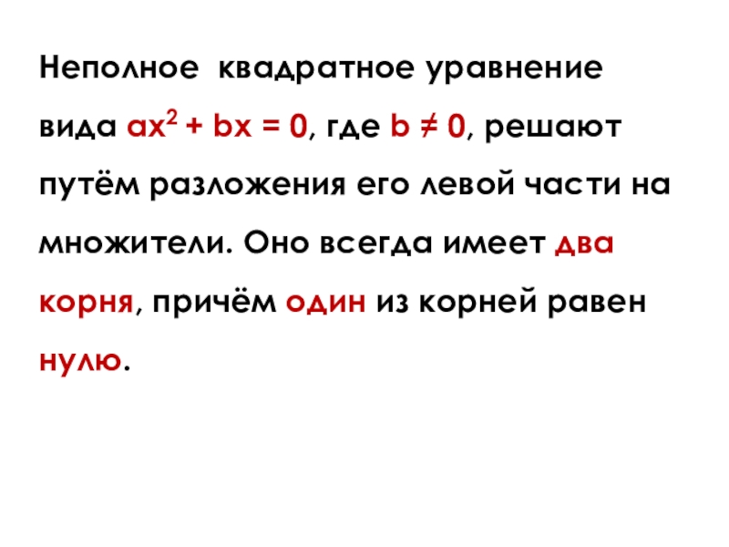 ≠ 0, решают путём разложения его левой части на множители. Оно всегда имеет два корня, причём один из корней равен нулю.